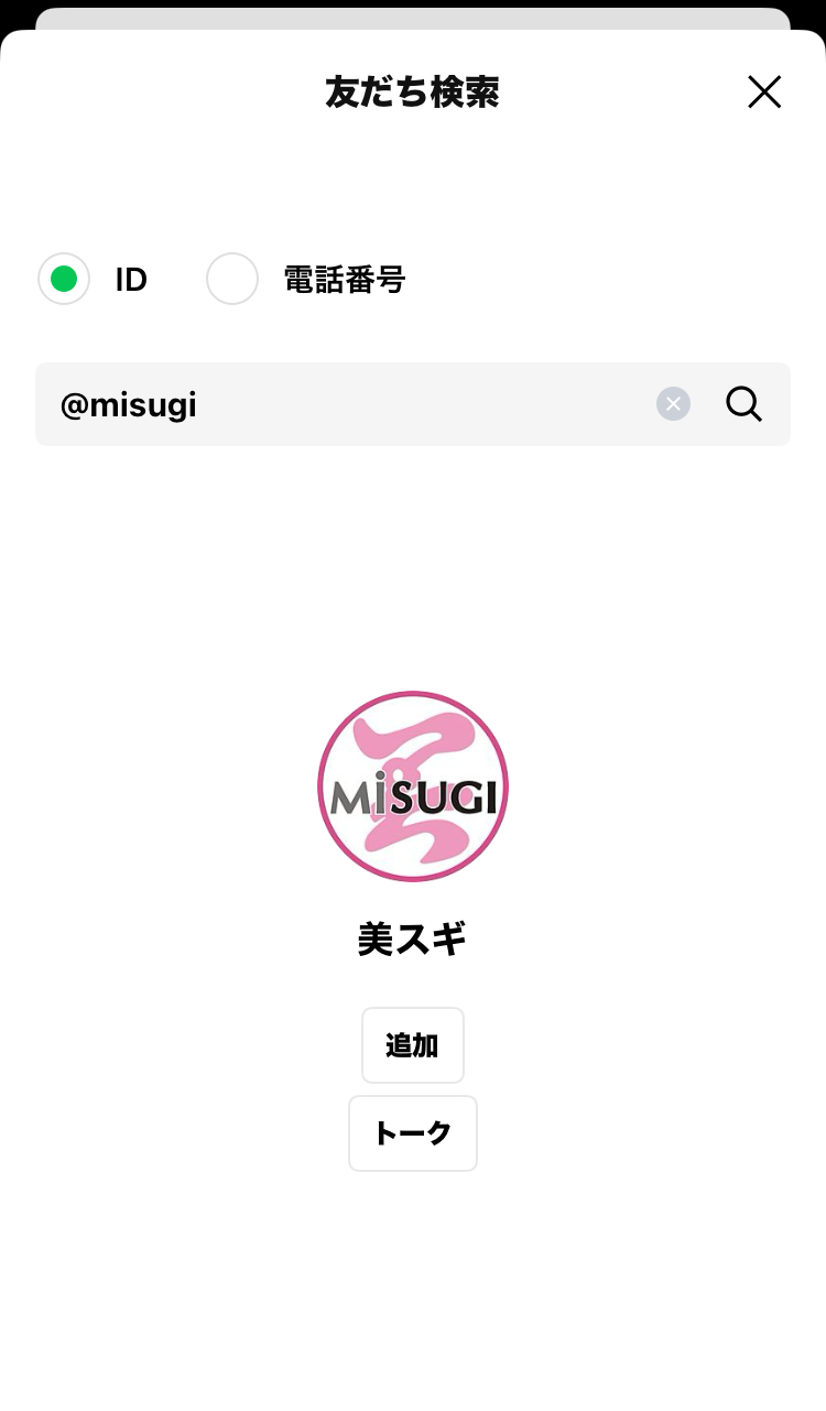 STEP1 LINEの友だち検索から、「@misugi」を検索して追加